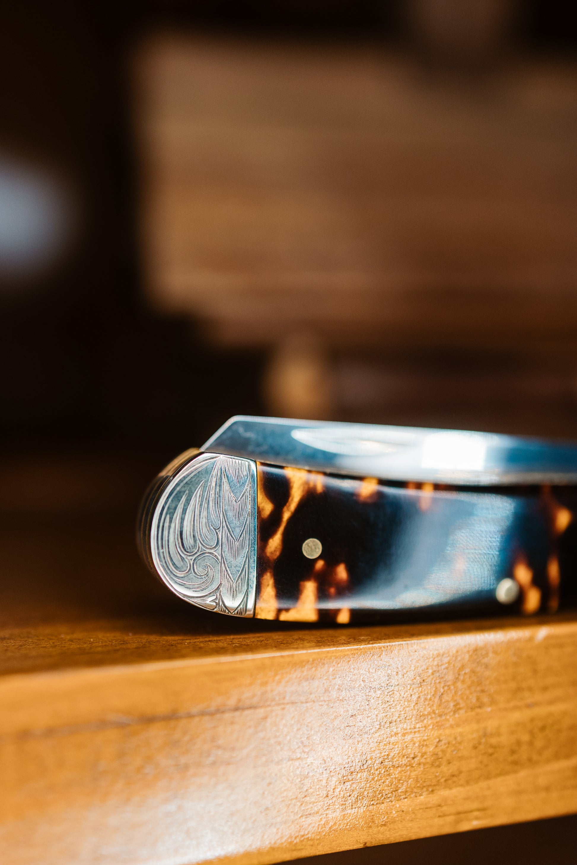 Boker Tortoise Trapper Knife, Hand Engraved by Owen Wuthrich on a 4 Bolsters. Features 2 blades: Blade lengths approximately 3" and closed length approximately 4.25". D2 Blades